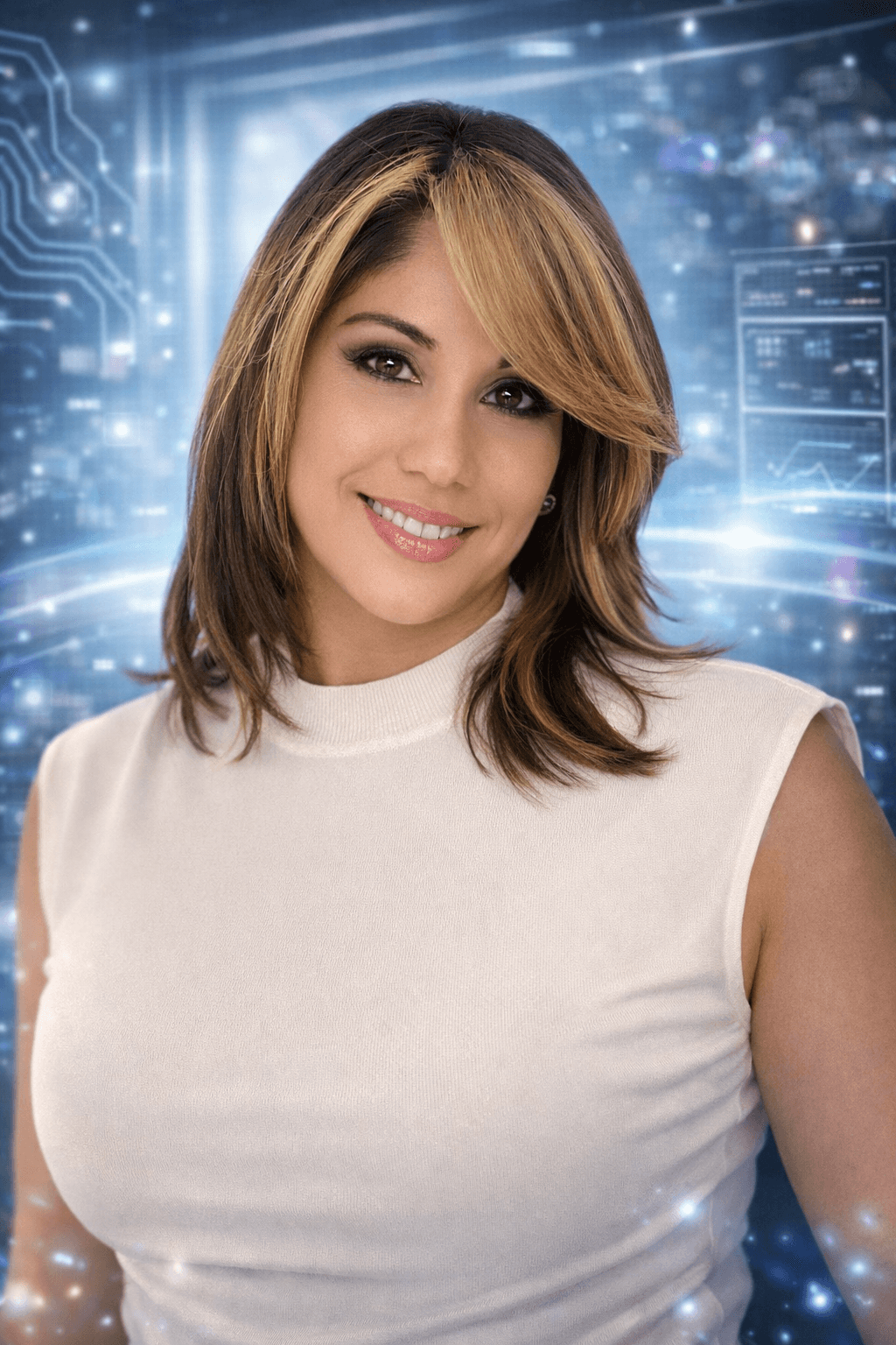 Add a subtle holographic background (light blue glow, abstract particles), no people in hero image.